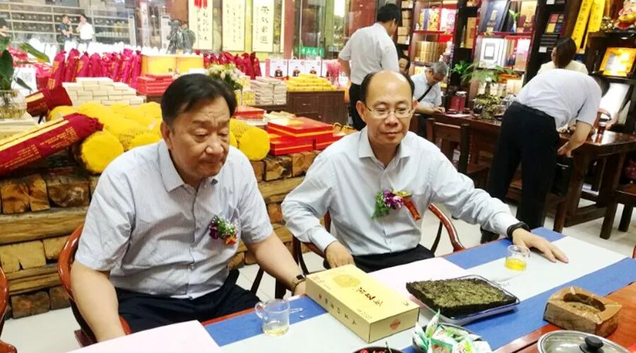 ▵ 中国茶叶流通协会会长王庆与济南市副市长王京文在山东运营中心品鉴两百担茯砖茶并签名留念