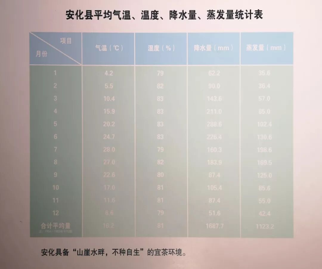 安化黑茶博物馆二楼摆着一组数据,显示着安化一年四季来的温度、湿度、降雨量、蒸发量,这从侧面反应了,山崖水畔,不种自生的由来。