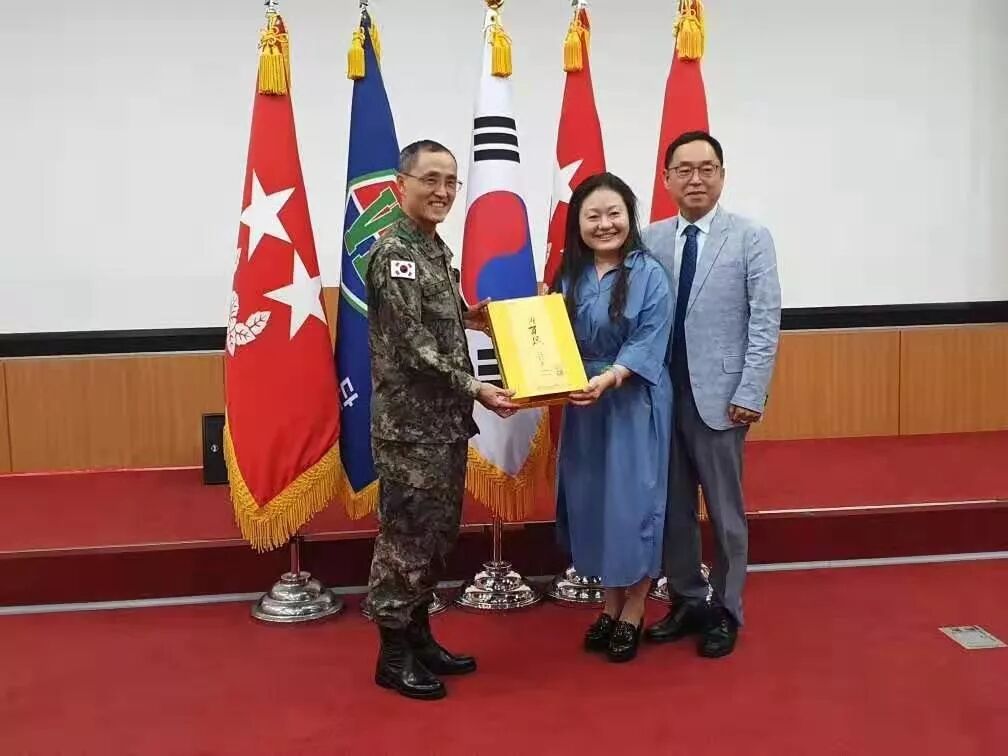 崔海燕女士和丈夫金先生将公司两百担茯砖茶赠予韩国第8军团团长
