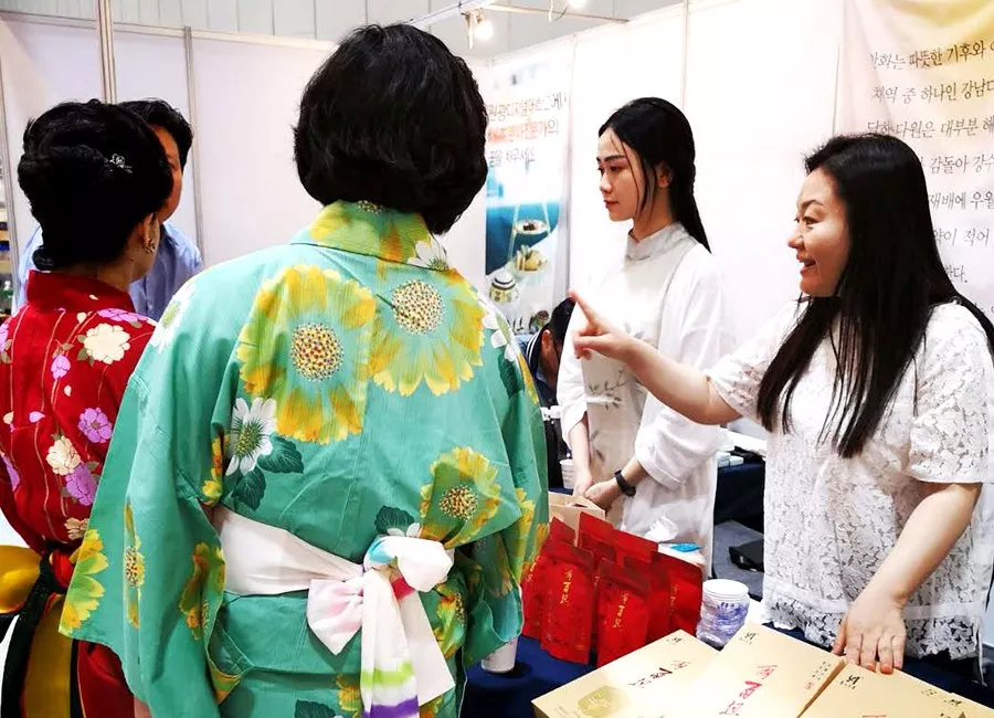 展会期间,负责中韩商贸往来的领事馆的何领事,也来到高马二溪展位了解情况,细心询问我们在韩国的计划与需求,同时提出,下次一定组织韩国商务考察团来湖南安化高马二溪进行现场考察。